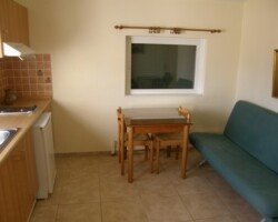 kuhinju (frižider, ugradni šporet sa dve ringle, kuker, posuđe za odgovarajući broj osoba), klima uz doplatu, u trpezarijskom delu se