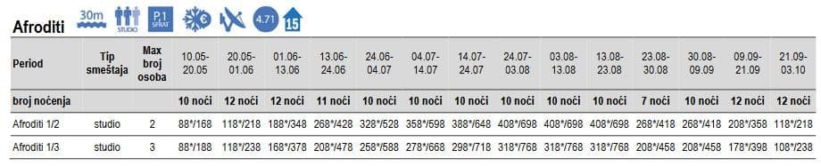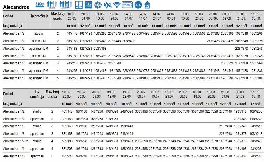 Cena za jednokrevetnu sobu (1/1) 699 € , mogućnost smeštaja jednog deteta 02-11.99 godina (isključivo u zajedničkom ležaju), u pratnji 2 odrasle osobe i jedino u tom slučaju ostvaruje popust i plaća 279 € . Ne postoji mogućnost smeštaja 3 odrasle osobe u standardnoj sobi.