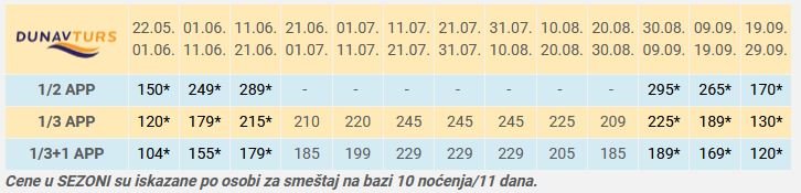 Cene u SEZONI su iskazane po osobi za smeštaj na bazi 10 noćenja/11 dana.