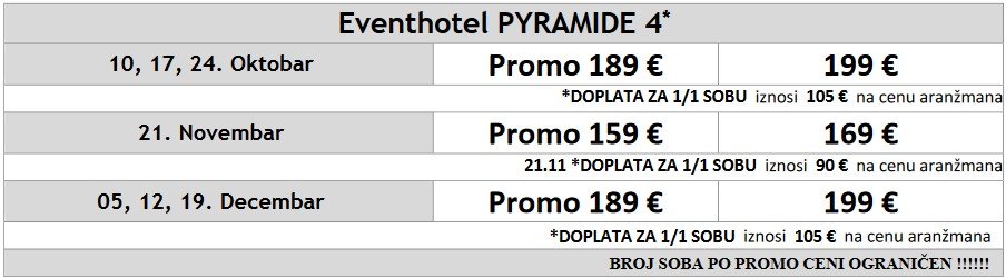 Dete u sobi sa dve punoplatežne osobe u hotelu Pyramide od 0 do 11.99 g. u pomoćnom ležaju ostvaruje popust -20 €. Po ovom programu ne postoji mogućnost umanjenja za sopstveni prevoz.