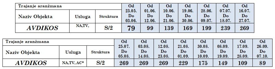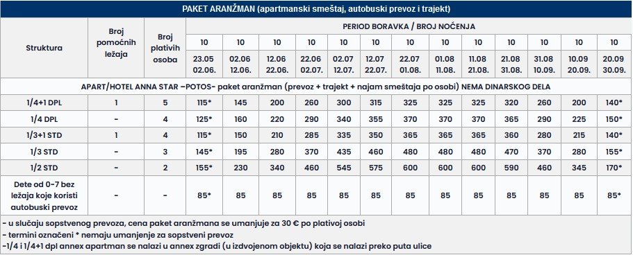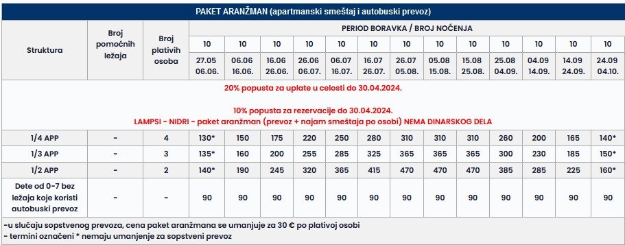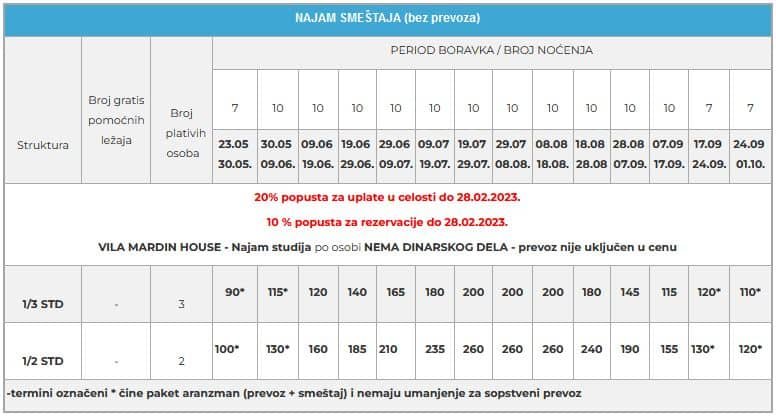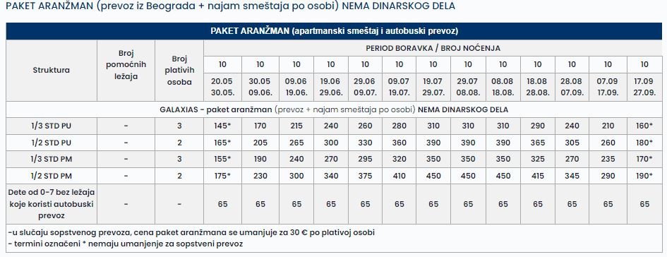 CENA U TABELI OBUHVATA PAKET ARANŽMAN PO OSOBI