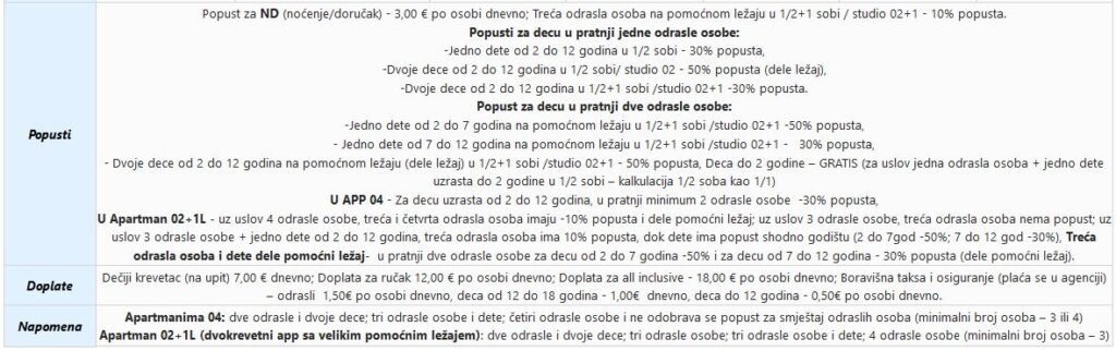 Moguće je izvršiti doplatu za polupansion – odrasle osobe 17 eur / dnevno, deca 2-12 godin 8.5eur / dnevno.
