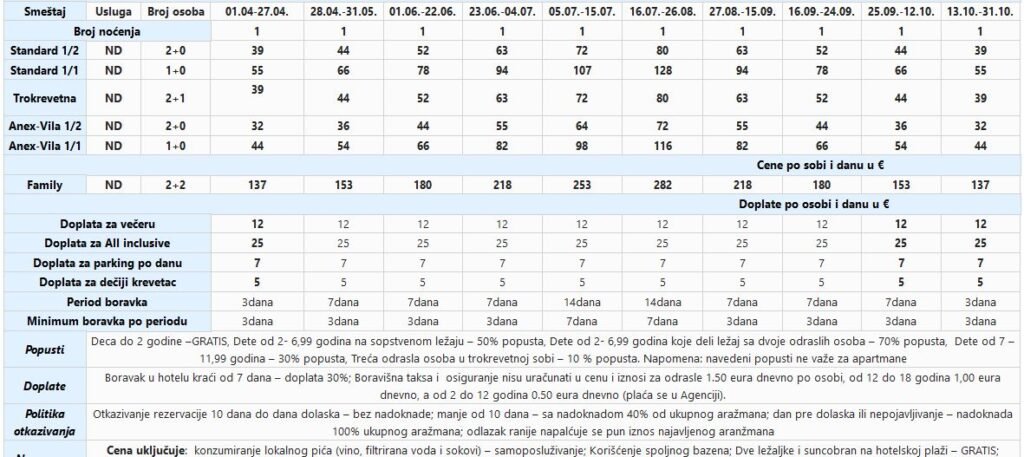 Dete od 3 do 7 godina u pratnji dve odrasle osobe besplatno na zajedničkom ležaju odnosno 25,00 eur dnevno na pomoćnom ležaju (standard soba, superior soba, standard vila)