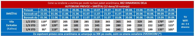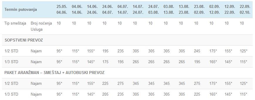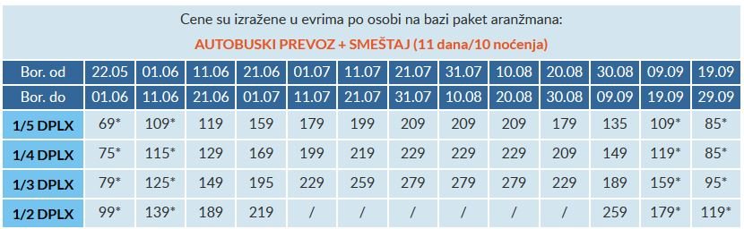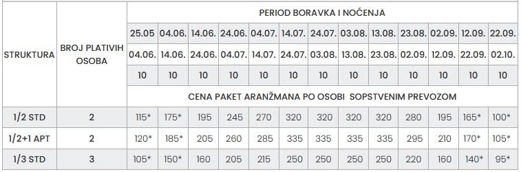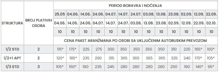 – Cene označene zvezdicom (*) su cene paket aranžmana (smeštaj i prevoz, bez teritorijalne doplate za prevoz) po osobi