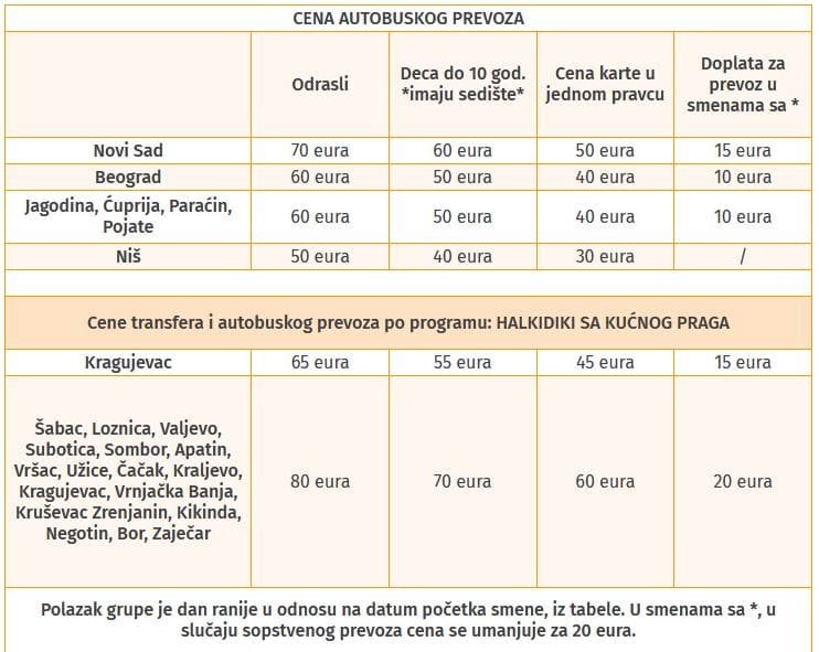 Program HALKIDIKI SA KUĆNOG PRAGA obuhvata transfer mini busom od kućne adrese putnika (iz mesta iz tabele) do lokacije gde grupu preuzima autobus i dalji transfer do odabrane vile ili hotela.