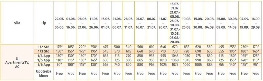 Legenda: 1/2 Std – Dvokrevetni studio; 1/3 Std – Trokrevetni studio; 1/4 App – Četvorokrevetni apartman; 1/5 App – Petokrevetni apartman; 1/6 App – Šestokrevetni apartman;