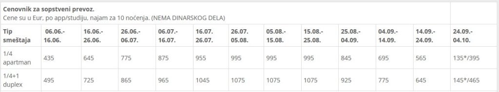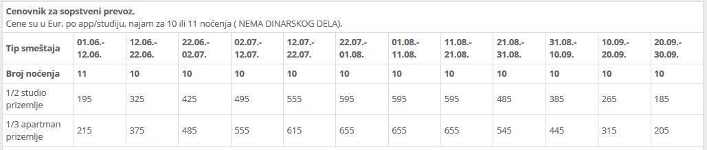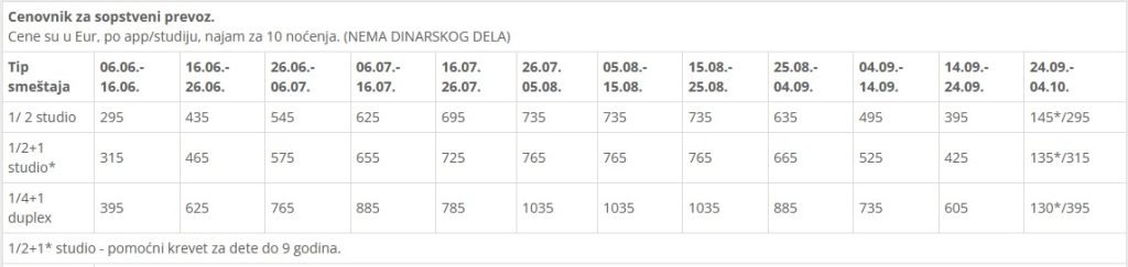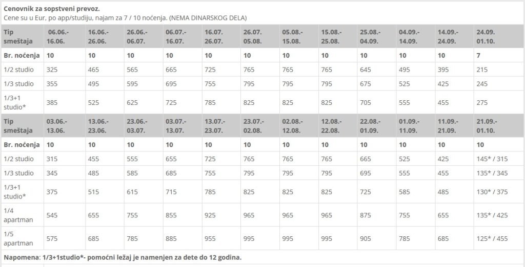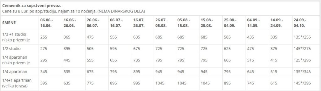 -Kod prodaje duple smene – prva smena gde je cena sa zvezdicom (*) i narednog termina, putnik plaća paket po osobi plus najam apartmana u sledećoj smeni. Isto važi i za poslednju smenu sa zvezdicom (*).