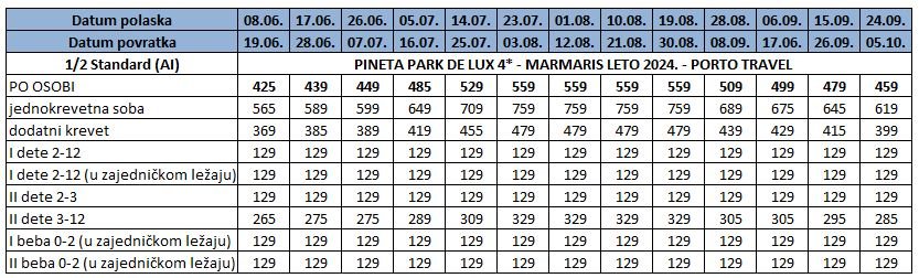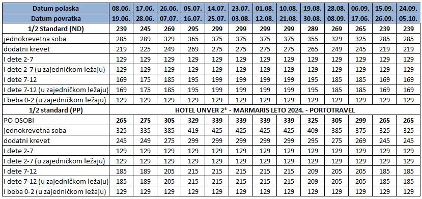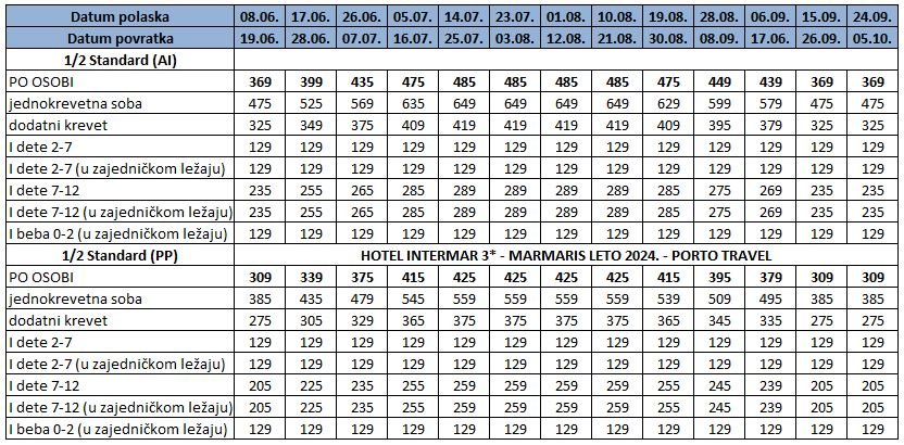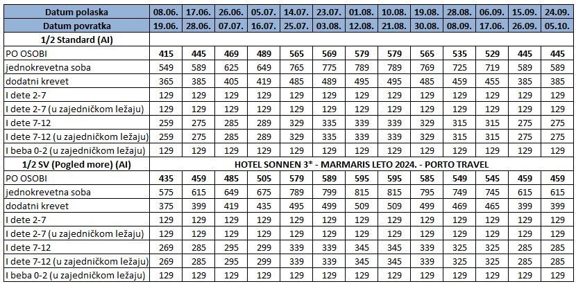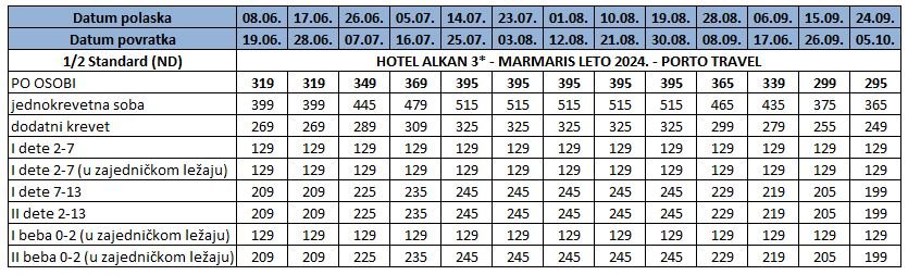 Dete od 0 do 7 godina (6,99) u pratnji dve punoplatežne osobe plaća 89 €, ukoliko nije u tabeli drugačije naznačeno, i ima smeštaj u zajedničkom ležaju, uslugu u hotelu kao punoplatežna osoba i mesto u autobusu.