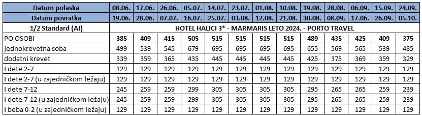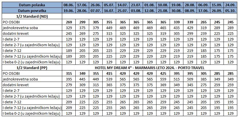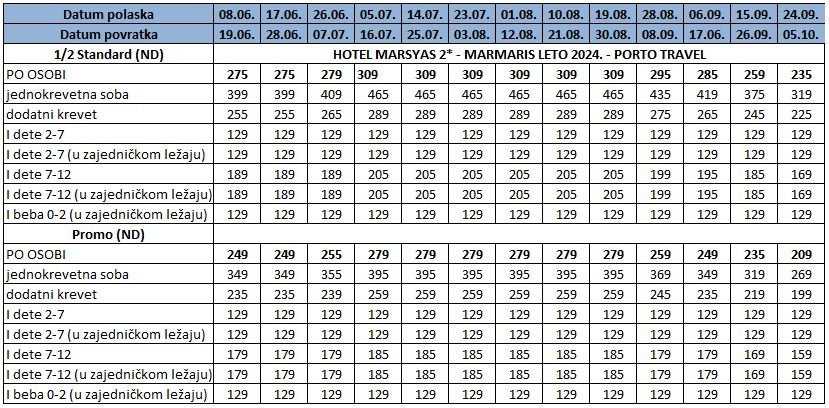 ARANŽMAN OBUHVATA: Vanlinijskiprevoz autobusom (visokopodni ili dabldeker, audio, video opremljenosti, prosečne udobnosti, bez obuhvaćenih usluga pića, hrane idr. tokom putovanja) narelaciji Beograd (Novi Sad) –Marmaris–Beograd (Novi Sad), boravak10 dana (9 noći), sa uslugom po izboru u dvokrevetnim ili dvokrevetnim sobama sa pomoćnim ležajem,troškove organizacije putovanja.