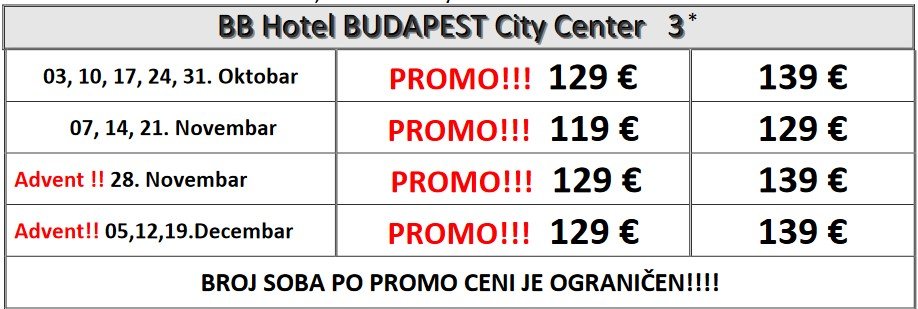 POPUSTI I DOPLATE: Rezervacija 1/1 soba je moguća isključivo NA UPIT i i doplata iznosi 35 € hotel Berlin 3*, doplata za iznosi 45 € hotel Budapest 3*, i doplata za hotel Hungaria City Center 4* 49 € .Popust za dete od 0-11,99 godina u pratnji dve punoplatežne osobe u dvokrevetnoj sobi iznosi 10 eur i odnosi se samo na hotel Budapest 3*. Po ovom programu ne postoji mogućnost umanjenja za sopstveni prevoz.