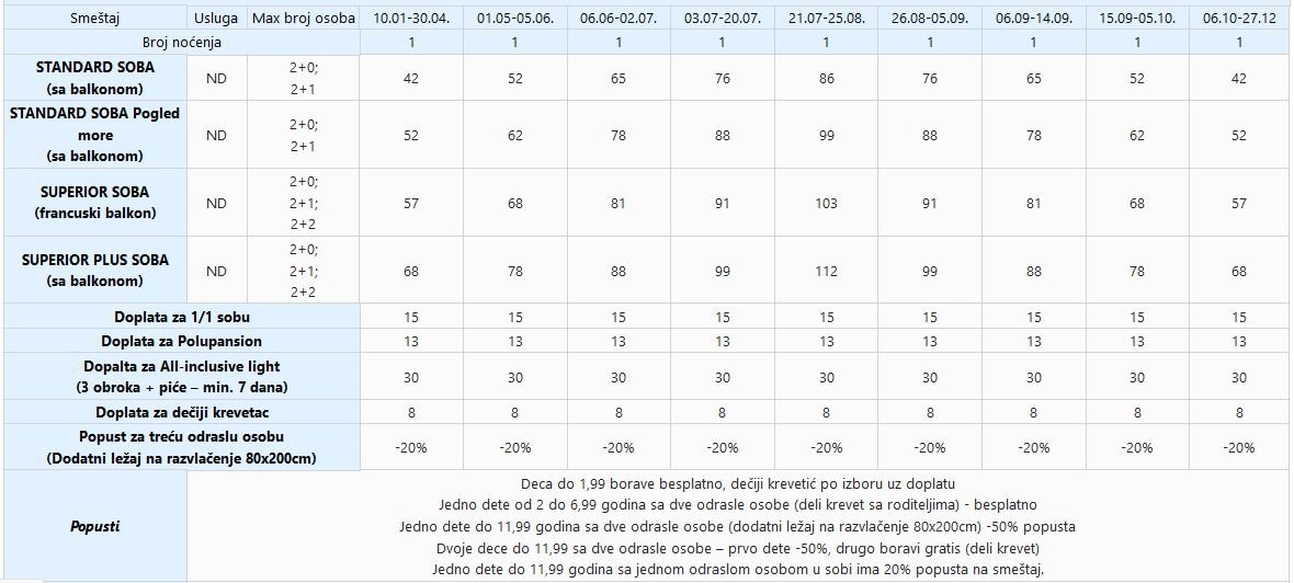 Smeštaj u izabranom tipu sobe na bazi usluge koja je navedena u cenovniku.