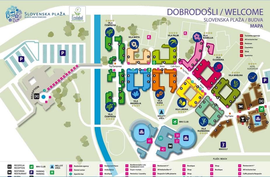 Na samo 50 metara od kompleksa prostire se najpoznatija i najduža budvanska plaža – Slovenska plaža, duga 1600 metara. Gosti turističkog naselja koriste ovu plažu, a u zelenom pojasu neposredno uz plažu gosti mogu uz povoljne cene i dodatne popuste koristiti plažni mobilijar.