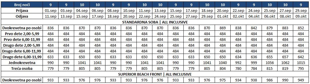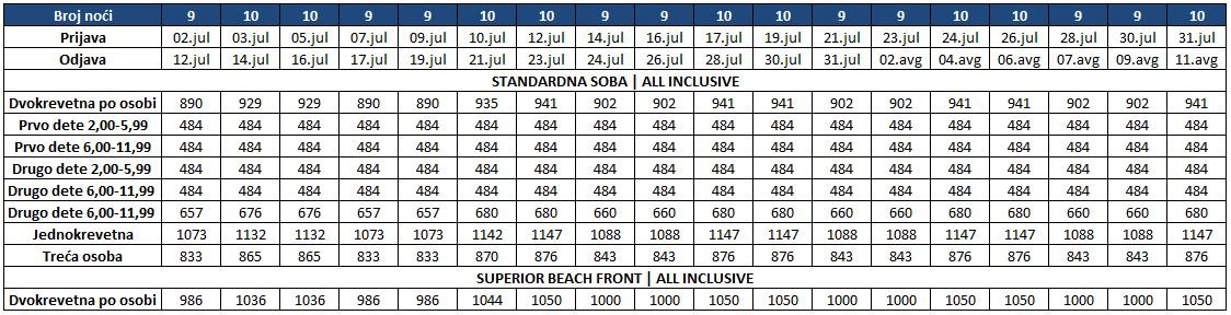 CENA U TABELI OBUHVATA PAKET ARANŽMAN PO OSOBI