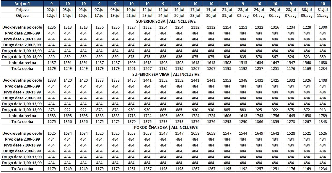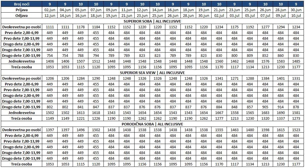 Plaća se: uvozna alkoholna pića, flaširana pića, restoran „La Terrace“, ceđeno voće.