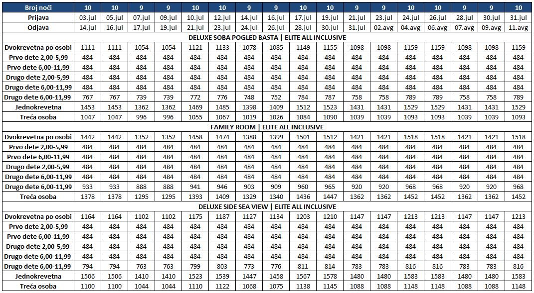 Usluga je All inclusive – doručak, ručak i večera (samoposluživanje – izbor više jela, po hotelskim pravilima).