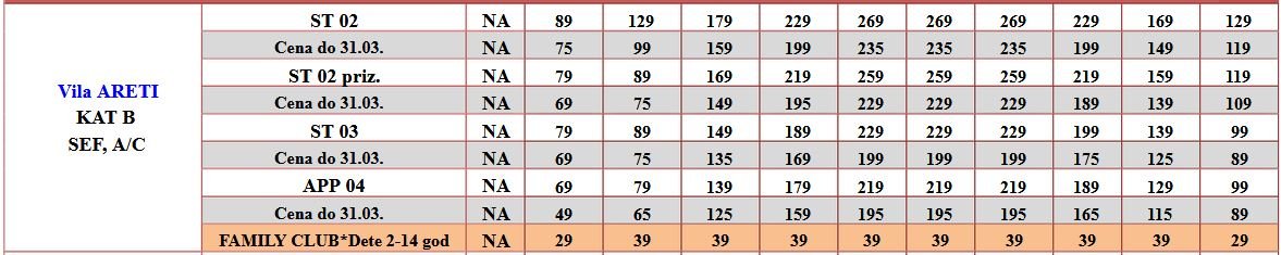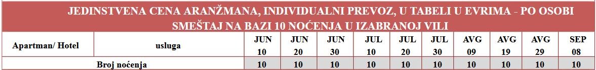 – usluge smeštaja na bazi najma studija/apartmana za izabrani termin prema tabeli na bazi 10 noćenja;
