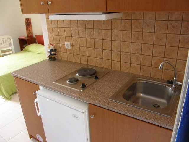 *Studio 02 i 03: sobe se sastoje od dva ili tri ležaja, kuhinjskog dela (frižider, ugradni šporet sa dve ringle, aspirator, posuđe za odgovarajući broja osoba), klima uz doplatu, kupatilo – tuš/wc sa peškirima. Balkon sa garniturom za sedenje.