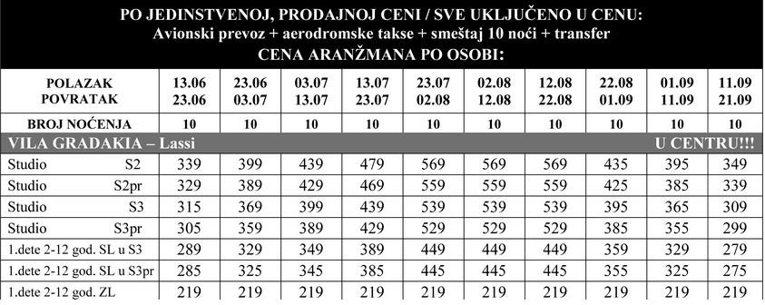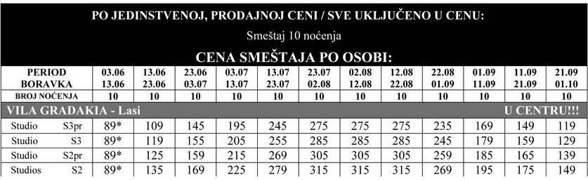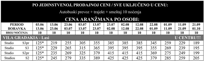 Cene iz tabele su po osobi u evrima i obuhvataju smeštaj, prevoz autobusom i trajekt