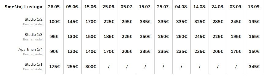 Cene su izražene u eurima po smeštajnoj jedinici za 10 noćenja
