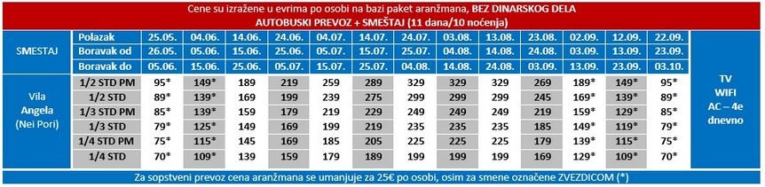 U slučaju spajanja smena na organizovanom prevozu, cena aranžmana za drugu smenu se umanjuje za 25 eur po osobi osim za smene koje su u tabeli označene zvezdicom (*)