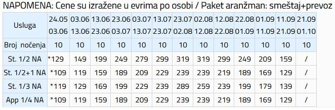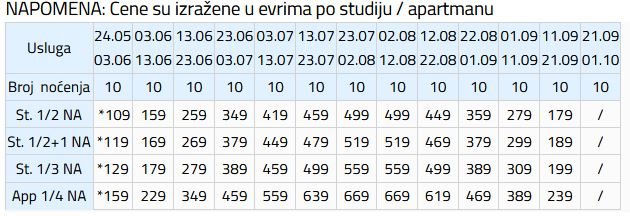 St. – Studio (spavaća soba u čijem sastavu je kuhinja, kupatilo i terasa); App – Apartman (spavaća soba + odvojena kuhinja); Duplex App – 2 spavace sobe +odvojena kuhinja); NA – najam
