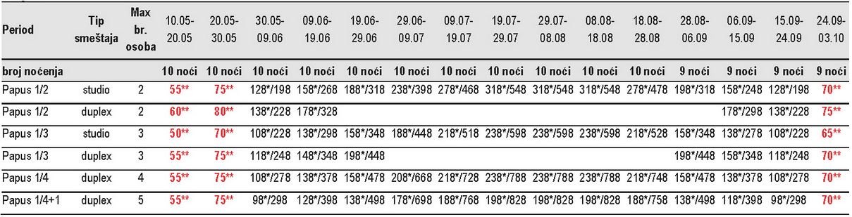 Vila Papus se nalazi u novom delu Sartija na 60m od obale. Iako starijeg datuma, kuća je privlačna kako zbog cene tako i zbog prostranih duplexa. Nalaze se u visokom prizemlju i na prvom spratu i imaju dve spavaće sobe, odvojenu kuhinju i predsoblje iz kog se ulazi u sve prostorije. Studiji su na 2. spratu. Sve smestajne jedinice imaju SAT TV, WIFI i klima uređaj čije se korišćenje doplaćuje.