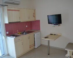 St 02/St 03: smešteni su na na prvom drugom spratu i poseduju francuski krevet, kuhinjski deo (frižider, rešo sa dve ringle, posuđe i pribor za odgovarajući broj osoba),kupatilo sa tuš kadom, TV, korišćenje klima uređaja je u ceni i balkon sa garniturom za sedenje. Svaki studio poseduje pomoćni ležaj na ravlačenje standardnih dimenzija.