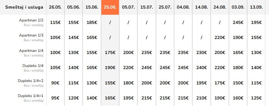 Cene su izražene u eurima po na bazi 10 noćenja po smeštajnoj jedinici