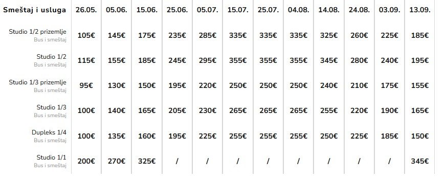 Cene su izražene u eurima po osobi na bazi 10 noćenja po smeštajnoj jedinici