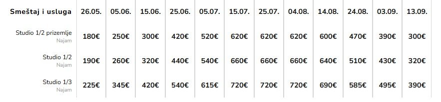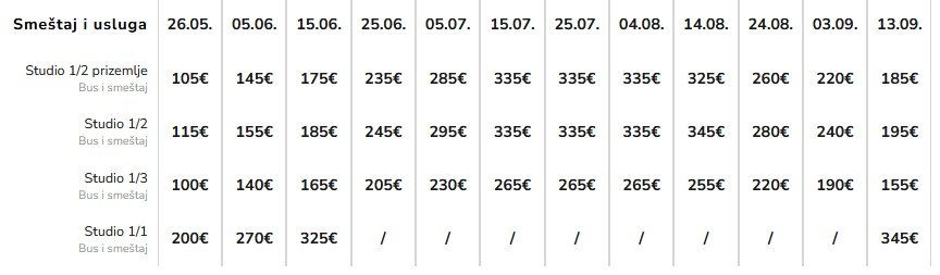 Cene su izražene u eurima po smeštajnoj jedinici za 10 noćenja